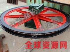 矿用天轮安装在井架上,作支撑,供矿井提升时支拖提升机卷筒到提升容器之间,引导钢丝绳转向之用。绳槽带塑衬或胶块,增加钢丝绳的使用寿命。